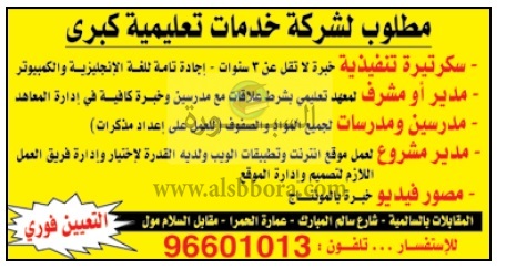 تعلن مؤسسة تعليمية في دولة الكويت عن وظائف جديدة للمدرسين والمدرسات في جميع المواد والإداريين وفقا لنص الإعلان التالي:-