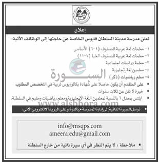 تعلن مدرسة خاصة في سلطنة عمان عن وظائف جديدة للمعلمين ومعلمات وفقا لنص الإعلان التالي:-