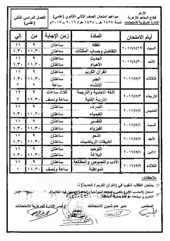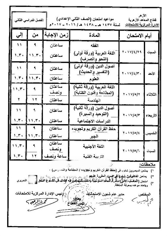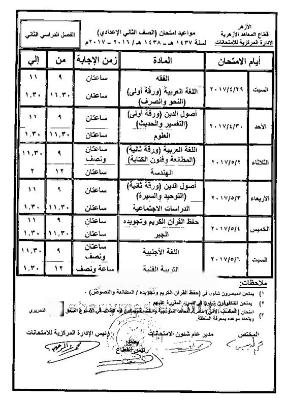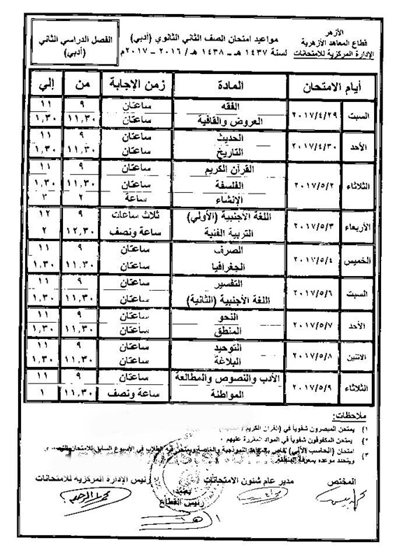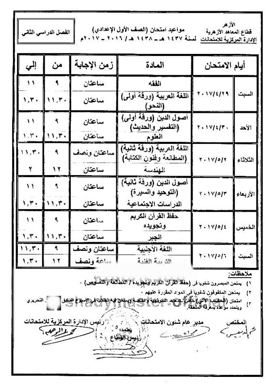 اعتمد الازهر الشريف لجدول امتحانات المراحل التعليمية المختلفة لنهاية العام 2017/2016