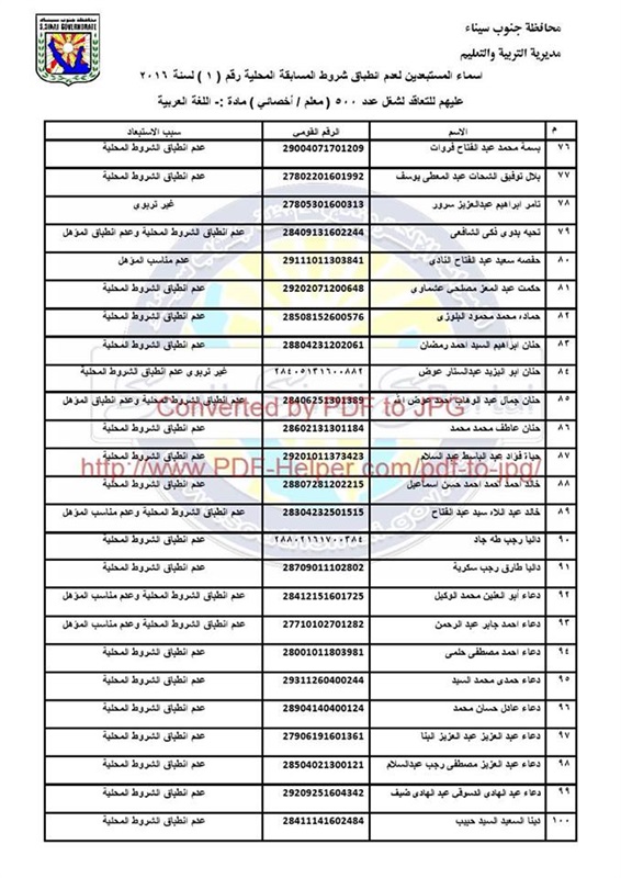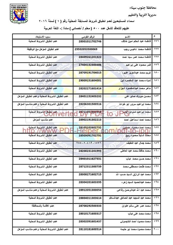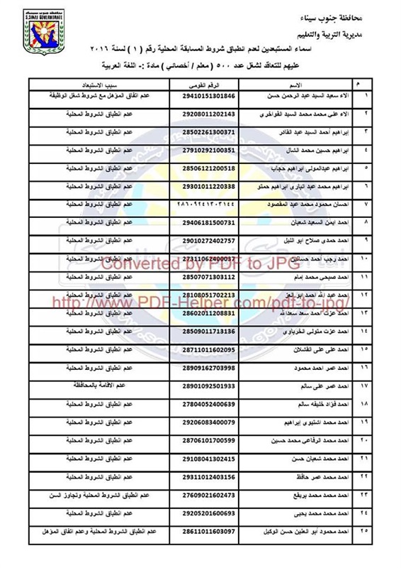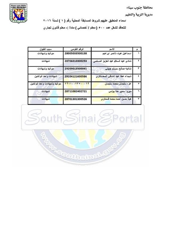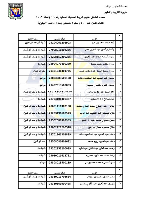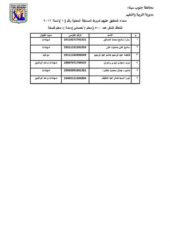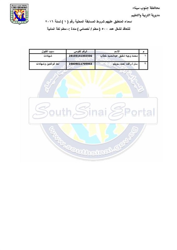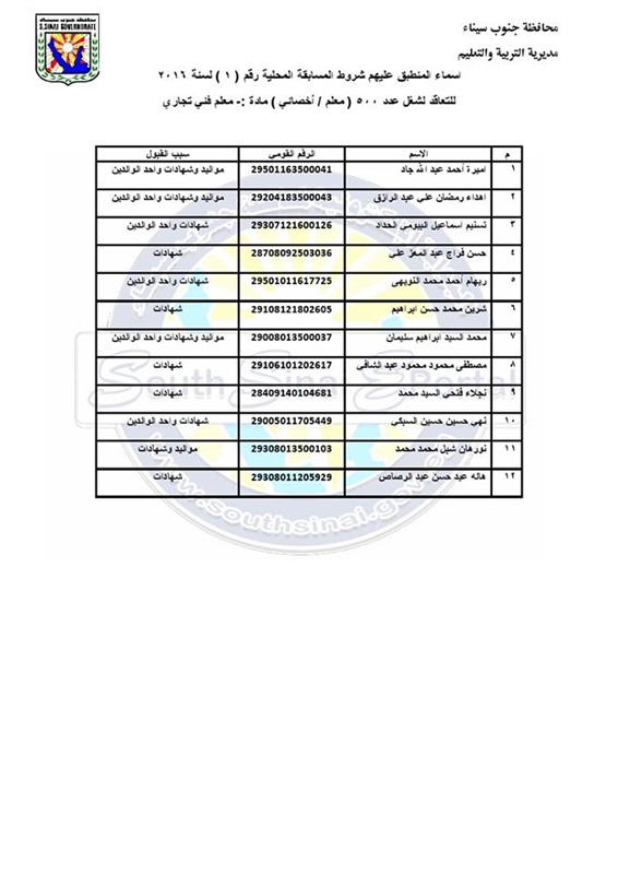 اعلنت وزارة التربية والتعليم عن نتيجة المقبولين والمستبعدين من وظائف"المسابقة المحلية بمحافظة جنوب سيناء لتعيين عدد 500 معلم مساعد فى عدد من التخصصات السابق الاعلان عنها خلال المسابقة رقم 1 لسنة 2016 لتعيين معلمين بتخصصات :