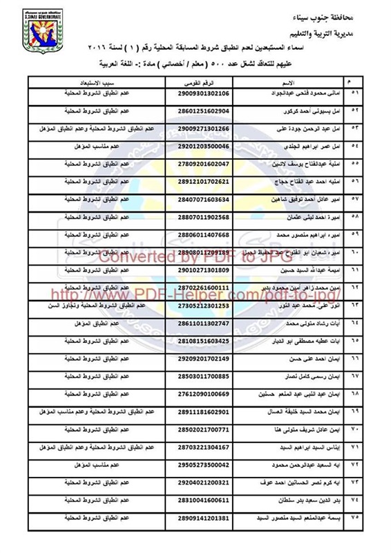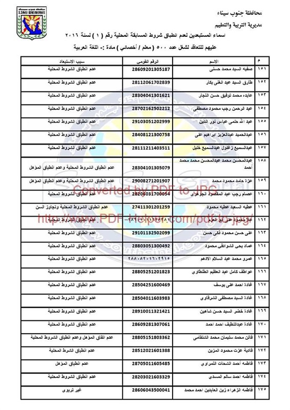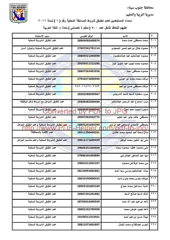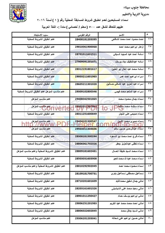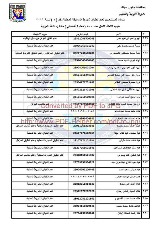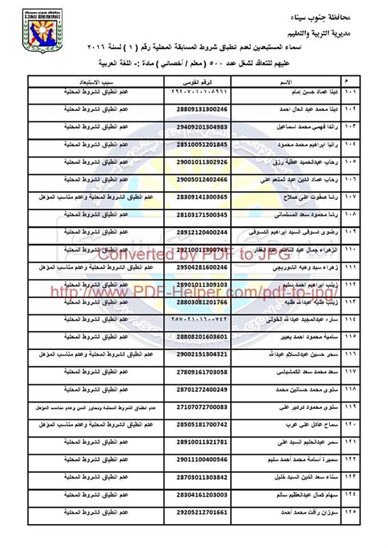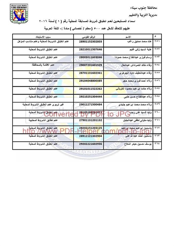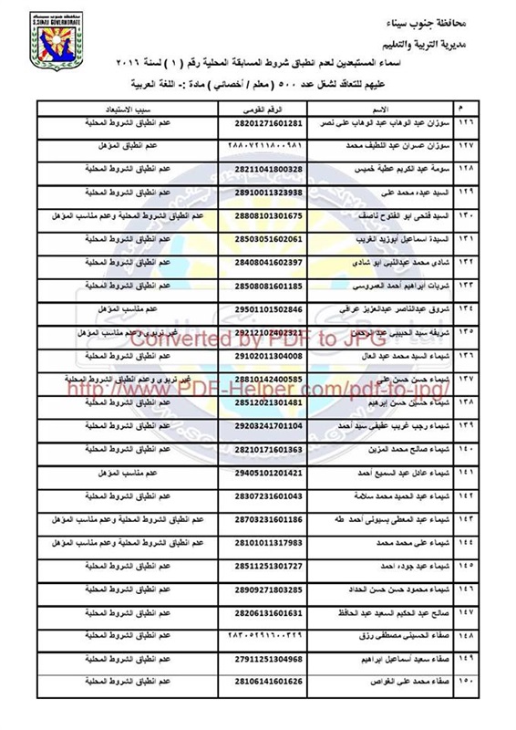 اعلنت وزارة التربية والتعليم عن نتيجة المقبولين والمستبعدين من وظائف"المسابقة المحلية بمحافظة جنوب سيناء لتعيين عدد 500 معلم مساعد فى عدد من التخصصات السابق الاعلان عنها خلال المسابقة رقم 1 لسنة 2016 لتعيين معلمين بتخصصات :