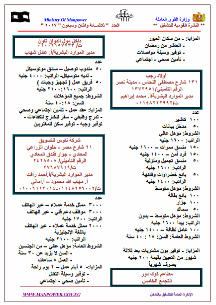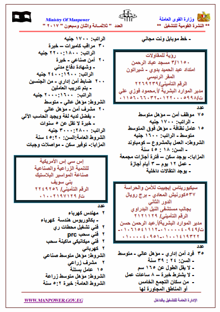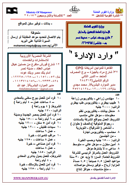 اعلنت وزارة القوى العاملة عن النشرة القومية للتشغيل لشهر مارس 2017 والتى تتضمن اكثر من 22000 وظيفة لعدد كبير من محافظات جمهورية مصر العربية والتى تناسب المؤهلات العليا من خريجى الكليات والمعاهد والدبلومات والشهادة الاعدادية والابتدائية ومحو الامية والعمال والمهن الحرة وغيرهم