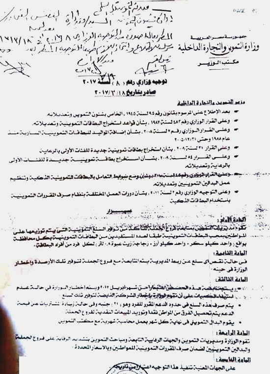 اخطرت وزارة التموين والتجارة الداخلية ، بتوجيه وزارة رقم 8 لسنة 2017 المديريات التموينية بالمحافظات من توفير السلع التموينية للمواطنين فى مواعيدها ، على ان يتم صرف السلع المدعمة شهرياً لكل فرد مقيد على بطاقات التموين بمعدل"كيلو سكر وكيلو أرز وزجاجة زيت طعام عبوة 800 جرام لتر" اعتباراً من شهر أبريل .