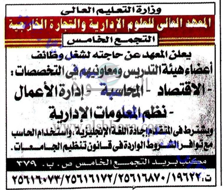 تعلن وزارة التعليم العالى عن حاجتها الى أعضاء هيئة التدريس للمعهد العالى للعلوم الادارية والتجارة الخارجية بالتجمع الخامس، وعلى الراغبين فى التقدم الاطلاع على الأرقام المنشورة فى الاعلان بجريدة الجمهورية اليوم الخميس 23 مارس 2017.