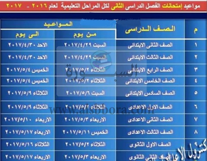 وتقرر أن تبدأ أمتحانات الصف الثانى الأعدادى ، للفصل الدراسى الثانى ، يوم الأربعاء الموافق 3 مايو القادم أن شاء الله ، وتنتهى يوم 10 مايو 2017 .
