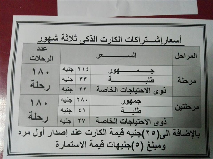 بعد ان اعلنت وزارة النقل بزيادة اسعار المترو اليوم الى 2جنية اعلنت الوزارة عن اسعار جديدة للاشتراكات مع طرح "الكارت الذكى" للاشتراك بالمترو وحددتت اسعار حاصة للجمهور والطلبة والتى جاءت كالتالى