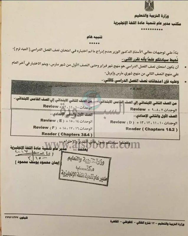 أعلن مكتب مدير عام تنمية مادة اللغة الانجليزية عن المقررات المحذوفة خلال امتحانات آخر العام لصفوف النقل بالمرحلتين الابتدائية والاعدادية.