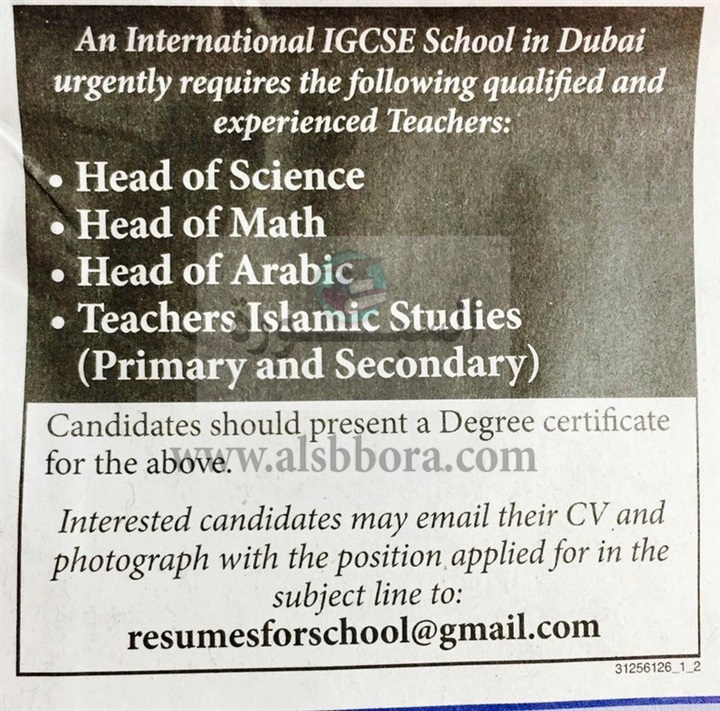 تعلن عدد من المدارس الخاصة في دبي عن وظائف جديدة للمعلمين والمعلمات وذلك في التخصصات الواردة في نص الإعلان التالي:-