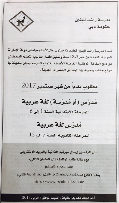 اعلنت مدرسة راشد للبنين بحكومة دبى وهى احدى المدارس الكبيرة العريقة بالامارات عن حاجتها لشغل عدد من الوظائف المطلوبة وفقا للاعلان المطلوب والذى جاء على النحو التالى :