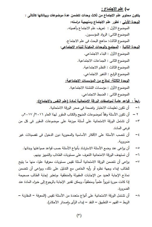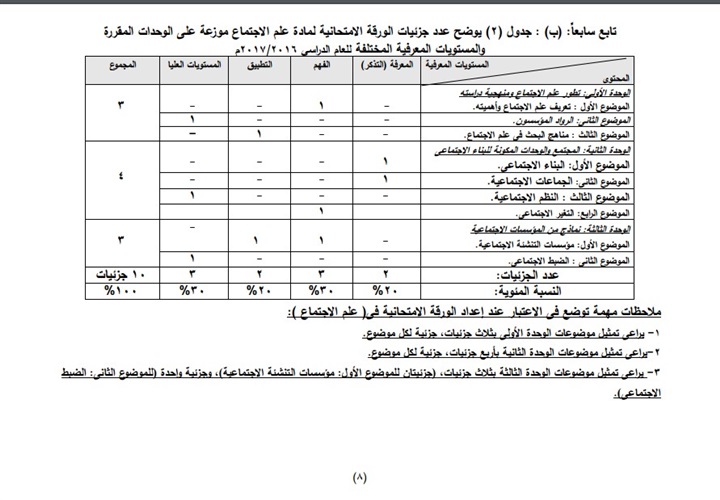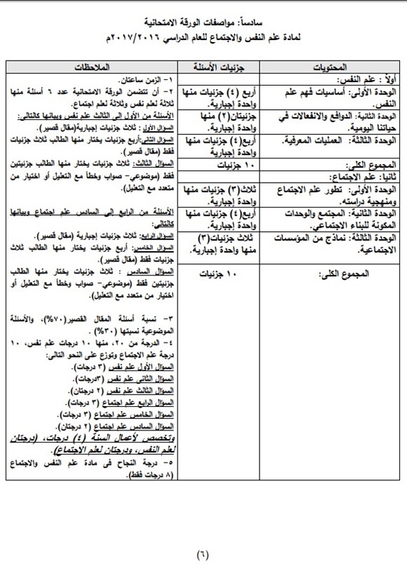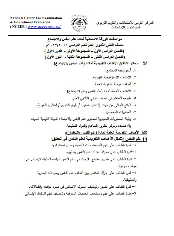تنشر لكم "السبورة" المواصفات القياسية لامتحان علم النفس والاجتماع، لعام 2016-2017، لطلاب الصف الثاني الثانوي، بالمدارس الحكومية والخاصة والتجريبية كما وضعها المركز القومي للامتحانات والتقويم التربوي .