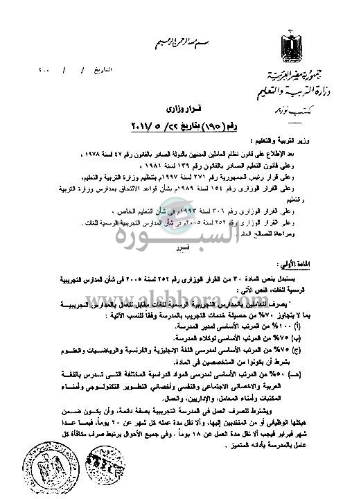 بالمستندات| تعرف علي بدلات العاملين بالمدارس التجريبية: 100% لمدير المدرسة و 75% للوكلاء والمعلمين