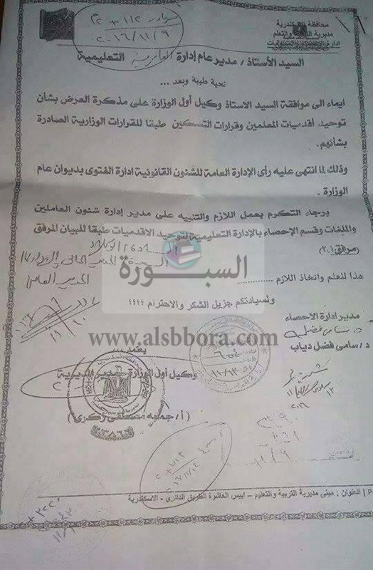 علم موقع "السبورة" أن قسم الاحصاء ببعض مديريات التربية والتعليم قامت بتعديل بيانات المعلمين بها طبقا للقرار الوزارى الصادر وليس طبقا للامر التنفيذى ومنها (الفيوم، الاسكندرية، مطروح )، جاء ذلك لانقاذ ترقيات نصف مليون معلم.