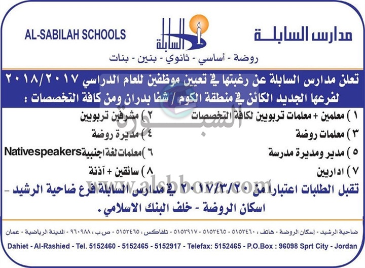 تعلن مدارس السابلة الأردنية عن وظائف جديدة للمعلمين والمعلمات في جميع المواد وفقا لنص الإعلان التالي:-