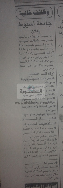تعلن جامعة اسيوط عن حاجتها الى قيادات بقسم التعليم والمستشفيات الجامعية طبقا لاحكام القانون رقم 81 لسنة 2016 زقرار رئيس مجلس الوزراء رقم 1596 لسنة 1991 بالائحة التنفيذية للقانون رقم 5 لسنة 1991، وتقدم الطلبات باسم الاستاذ الدكتور رئيس الجامعة مرفقا به جميع المستندات المطلوبة خلال 15 يوما من تاريخ نشر الاعلان بجريدة الجمهورية.