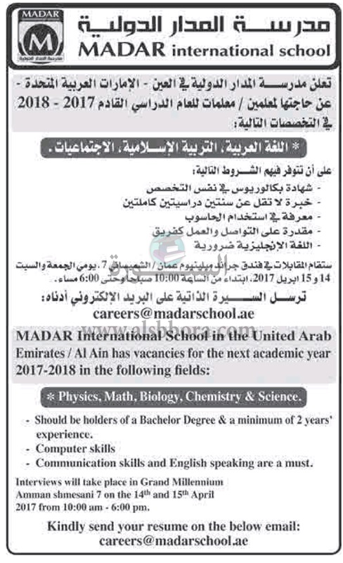 تعلن مدارس المدار الإماراتية عن وظائف جديدة للمعلمين والمعلمات في المواد الواردة في نص الإعلان التالي:-