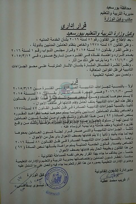 أصدرت مديرية التربية والتعليم ببورسعيد قرارا بشأن الآثار المترتبة على محو الجزاءات التأديبية فى ظل القوانين المتعاقبة.