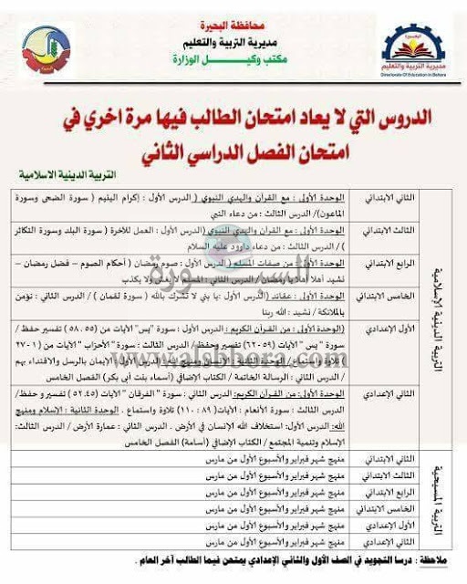التعليم تعلن رسميا الدروس المحذوفة لمنهج التربية الدينية الإسلامية و المسيحية فى إمتحانات اخر العام لصفوف النقل