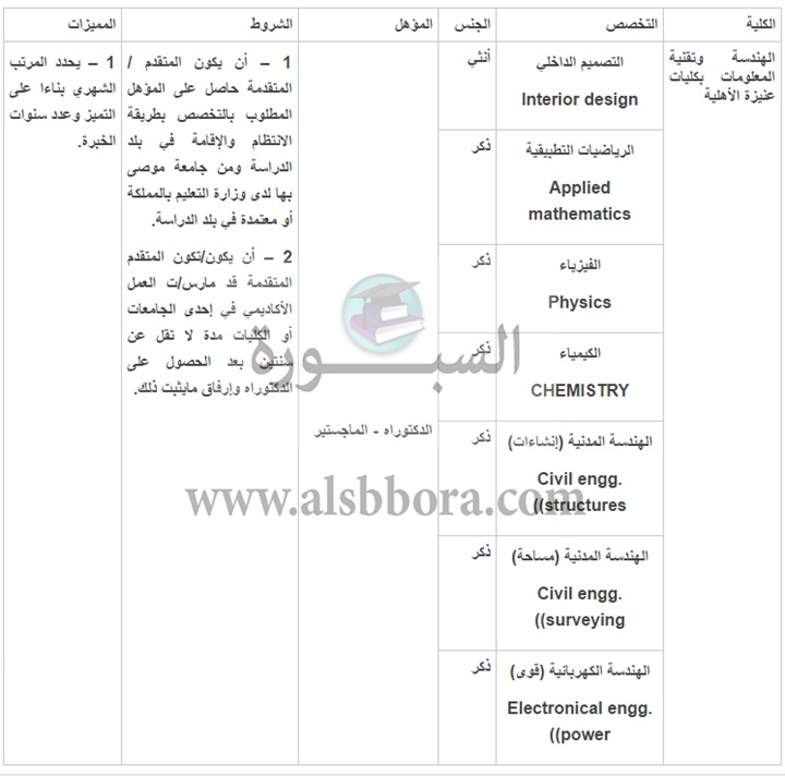 تعلن كليات عنيزة السعودية والتي مقرها محافظة عنيزة بمنطقة القصيم في المملكة العربية السعودية عن حاجتها لشغل الوظائف الأكاديمية التالية حسب الشروط والمميزات الموضحة: