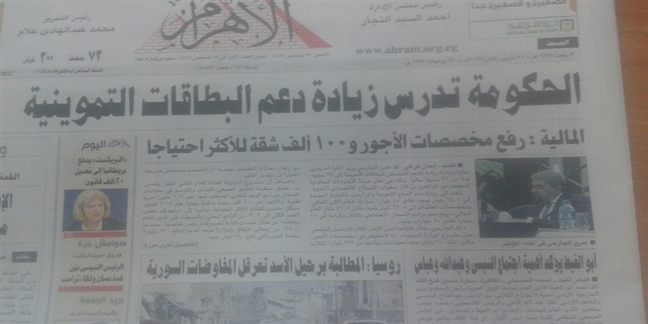 اكد عمرو الجارحى وزير المالية أنه يجرى حاليا دراسة زيادة الدعم المخصص للبطاقات التموينية الى 27 جنيها بدلا من 21 جنيها حاليا، وذلك فى اطار حزمة الاجراءات الحكومية للتخفيف عن المواطنين من اثار خطوات الاصلاح الاقتصادى الاخيرة.
