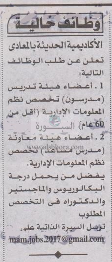 الاكاديمية الحديثة بالمعادى تعلن عن حاجتها الى أعضاء هيئة تدريس ومعاونيهم.. ننشر نص الاعلان