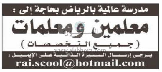 تعلن كبرى المدارس العالمية بالرياض بالمملكة العربية السعودية عن حاجتها الى معلمين ومعلمات فى جميع التخصصات، وعلى الراغبين فى التقدم ارسال السيرة الذاتية عبر الايميل المنشور فى الاعلان التالى: