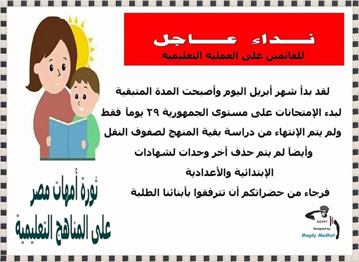 "لقد بدأ شهر ابريل اليوم وأصبحت المدة المتبقية لبدء الامتحانات على مستوى الجمهورية 29 يوما فقط ولم يتم الانتهاء من دراسة بقية المنهج لصفوف النقل وايضا لم يتم حذف آخر وحدات لشهادات الابتدائية والاعدادية، فرجاء من حضراتكم ان تترفقوا بابنائنا الطلبة".