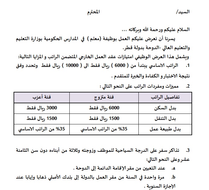 - راتب مميز للمتزوج 6000 ريال قطرى وعلاوة سكن 6000