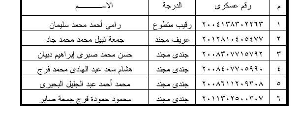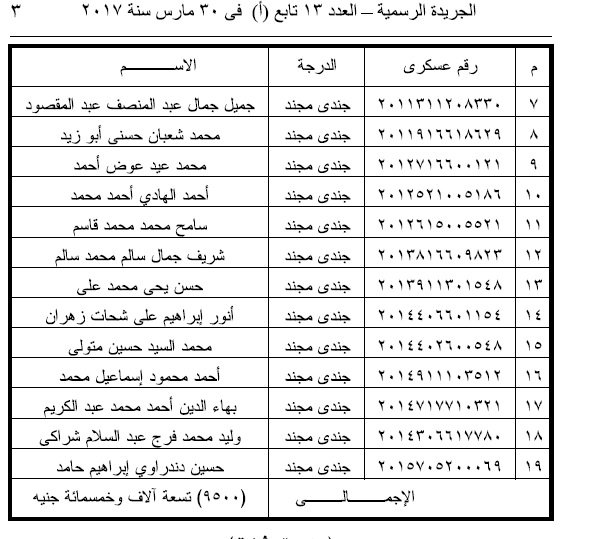 وجاءت المادة الأولي، المنشورة في الجريدة الرسمية، الصادر بعددها اليوم الأحد، من قرار الرئيس، يمنح معاش استثنائي مقداره خمسمائة جنيه لكل من ضباط الصف المتطوعين والجنود المجندين السابقين المذكورين بعد والمنتهية خدمهتم، وهم.