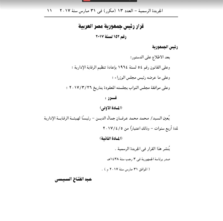 كما نشرت الجريدة الرسمية، قرار الرئيس رقم 152 لسنة 2017، بتعيين محمد محمد عرفان جمال الدين، رئيساً لهيئة الرقابة الإدارية لمدة أربعة سنوات- اعتباراً من 5/4/2017.