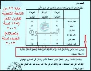 3-لايحق للموجه العام بالمديرية او وكيل الوزارة او الوزير نفسه او اى مسئول ايا كان منصبه وموقعه تحميل المدرس فوق نصابة القانوني الذي نصت عليه المادة رقم 22 من اللائحة التنفيذية للقانون 155 لسنة 2007 واخر تعديلاته ، و طبقا لبطاقات الوصف الوظيفى للمعلمين الصادرة بالقرار الوزارى 164لسنة2016، والتى تعتبر جزء اصيل من اللائحة التنفيذية لقانون 155 لسنة 2007.