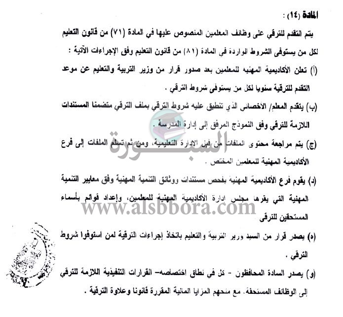 # ترقيات المعلمين يحكمها نص المادة رقم 81 من القانون رقم 93 لسنة 2012م .