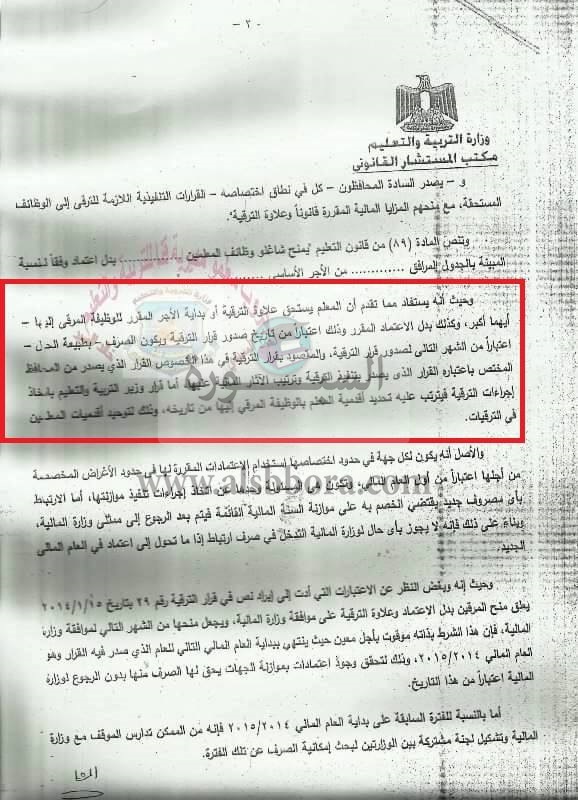 # فتوي المستشار القانوني للوزير التي تنص علي ان الترقيات تكون اعتبارا من تاريخ صدور قرار وزير التربية والتعليم لتوحيد اقدميات المعلمين .