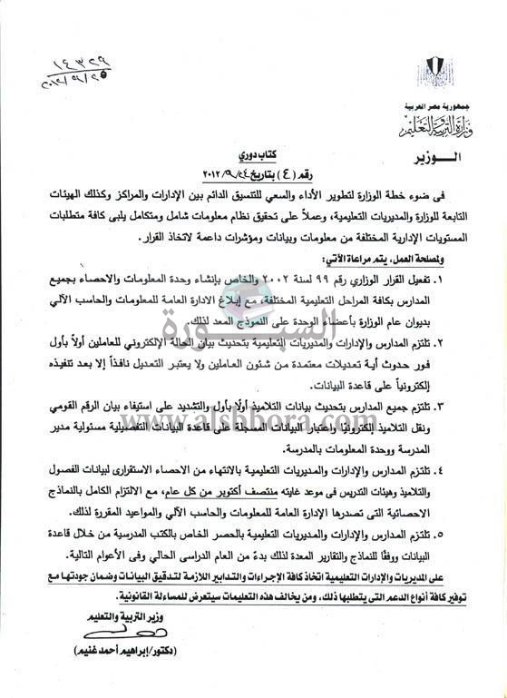 # الكتاب الدوري رقم 4 لسنة 2012م بتحديث بيانات المعلمين والخاص بقسم الاحصاء وفي حالة عدم التحديث يتم تحويلهم للتحقيق بمعرفة الشئون القانونية