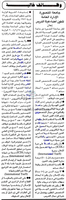 تعلن جامعة المنصورة علن حاجتها للتعاقد مع أعضاء هيئة التدريس "من حملة الماجستير والدكتوراه" وذلك في عدد من التخصصات الواردة في الإعلان التالي:-