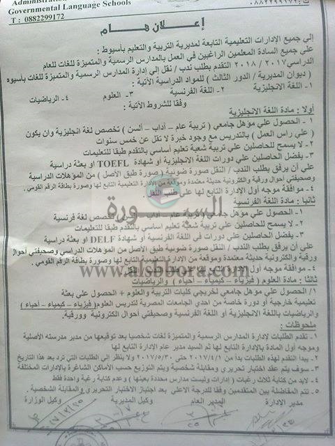 أعلنت مديرية التربية والتعليم بمحافظة أسيوط عن حاجتها الى معلمين عن طريق الندب أو النقل الى المدراس الرسمية والمتميزة للغات للعام الدراسى 2018/2017، وعلى الراغبين فى التقدم الذهاب الى ديوان المديرية فى الدور الثالث.