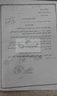 ينشر موقع " السبورة"، قرار وزارة التربية والتعليم على اجراء الاختبار البعدى للتلاميذ الضعاف والذين تم تطبيق البرنامج العلاجى عليهم بالمرحلتين الابتدائية والاعدادية بجميع المدارس وذلك يوم11 ابريل2017.