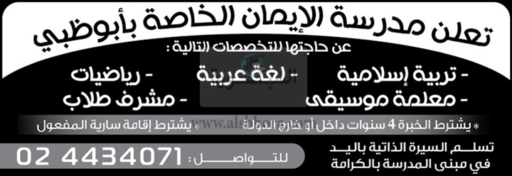 تعلن مدرسة الايمان الخاصة بامارة ابوظبى بدولة الامارات العربية عن حاجتها الى معلمين ومعلمات، وعلى الراغبين فى التقدم الاتصال بالرقم المنشور فى الاعلان التالى: