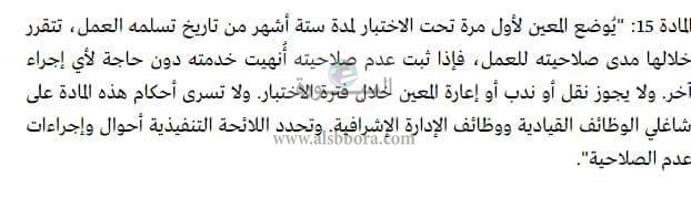 المادة 15 فى قانون الخدمة المدنية والتى تتحدث وضع المتقدم للتعيين فى الوظائف الحكومية تحت الاختبار 6 شهور وفى حالة ثبات عدم صلاحيته للعمل تم طرد بدون اتخاذ أى اجراء آخر وهنا يتساءل الجميع كيف سيتم تحديد عدم الصلاحية فهى جملة مطاطة .