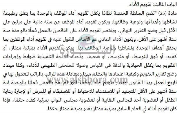المادة 25 فى قانون الخدمة المدنية والخاصة بقيام الادارة أو الوزارة التى يعمل بها الموظفين بوضع نظام معين لتقويم الموظفين ويكون ذلك مرتين كل سنة ، والخطر فى هذه المادة هو من سيقوم بوضع هذه التقارير وفى حالة وجود خلاف بين الموظف ورئيس الوحدة كيف سيتم كتابة ذلك التقرير .