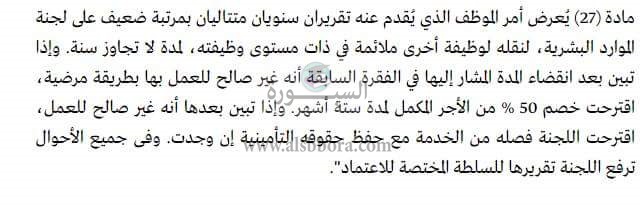 المادة 27 : وتتحدث هذه المادة عن الموظف الذى يحصل على تقريران سنويان بدرجة ضعيف حيث سيتم نقله لوظيفة أخرى لمدة سنة وفى حالة عدم صلاحيته لهذه الوظيفة سيتم خصم 50% من أجره المكمل لمدة 6 شهور وفى حالة عدم صلاحيته مرة أخرى يتم فصله .
