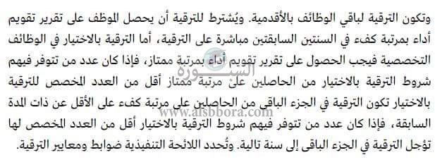 المادة 29 فى قانون الخدمة المدنية تتحدث عن شروط الترقية للموظفين وترتبط ارتباطا وثيقا بتقارير تقويم الأداء حيث يجب أن تكون كفء فى السنتين السابقتين لموعد الترقية وسيتم تأخير الترقية فى حالة عدم حصوله على تلك الدرجة