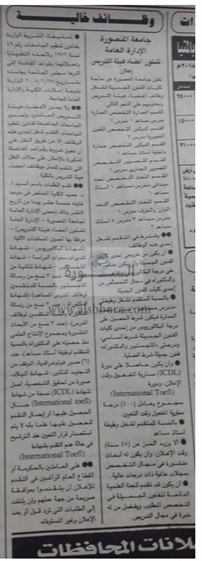 اعلنت جامعة المنصورة عن حاجتها لشغل وظائف اعضاء هيئة التدريس ومعاونيهم