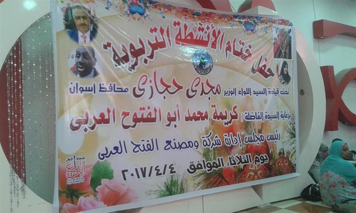 شهد محافظ اسوان اللواء مجدي حجازي ختام حفل الأنشطة التربوية المقام بإدارة ادفو التعليمية ، وكان في استقباله مختار شاهين وكيل وزارة التربية والتعليم بأسوان عبدالكريم لطفي مدير عام التعليم العام وحمدنا الله عبدالعزيز مديرعام إدارة ادفو والمهندس رئيس الوحدة المحلية لمركز ومدينة ادفو والقيادات التعليمية بإدارة ادفو والمديرية والموجهون الأوائل والعموم للأنشطة التربوية ورئيس مجلس الامناء والمعلمين بإدارة ادفو ونواب مديري إدارات اسوان فيصل نعيم وإدارات نصر النوبة ودراو وكوم امبو ولفيف من القيادات الشعبية بادفو وعلي رأسهم النائبة مني شاكر عضو مجلس النواب عن ادفو