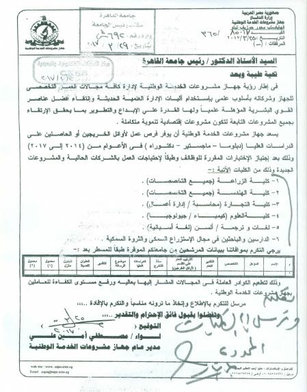 اعلن جهاز الخدمة الوطنية التابع لوزارة الدفاع عن توفير فرص عمل لاوائل الخريجين او الحاصلين على الدراسات العليا ( الدبلوما – ماجستير – دكتوراة ) فى الاعوام من 2014 الى 2017 وذلك بعد اجتياز الاختبارات المقررة للوظائف وطبقا لاحتياجات العمل بالشركات الحالية والمشروعات الجديدة