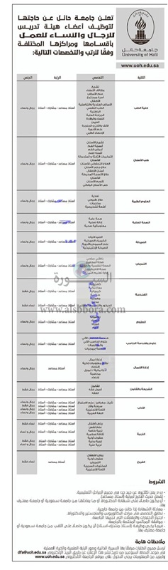 تعلن جامعة حائل بالسعودية عن وظائف جديدة لأعضاء هيئة التدريس "من حملة الماجستير والدكتوراه" وذلك وفقا لنص الإعلان التالي: -