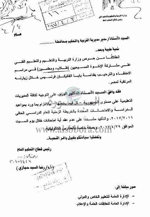 ينشر موقع السبورة القرار الرسمى من قبل وزارة التربية والتعليم بمنع عقد امتحانات نهائيا فى جميع المدارس على مستوى المديريات التعليمية بالمحافظات، نظرا للزيارة المرتقبة للبابا الفاتيكان فرنسيس يوم السبت الموافق 29 أبريل الجارى.