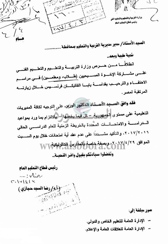 تنشر "السبورة" فاكس وزارة التربية والتعليم لجميع المديريات وذلك لإلغاء امتحانات يوم السبت الموافق 29 أبريل بجميع مراحل التعليم وذلك بسبب زيارة بابا الفاتيكان للقاهرة، وحرص الوزارة على مشاركة الأخوة المسيحيين طلاب ومعلمين فى مراسم الاحتفاء والترحيب بقداسة بابا الفاتيكان فرنسيس خلال زيارتة المرتقبة لمصر.