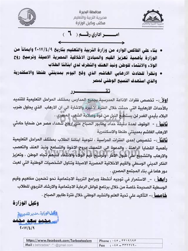 اصدر محمد سعد محمد، وكيل وزارة التربية والتعليم بالبحيرة، قرارا بوقف جميع الحفلات والأنشطة التي تتم داخل المدارس وذلك حدادا على ارواح شهداء انفجار كنيستي الغربية و الاسكندرية.