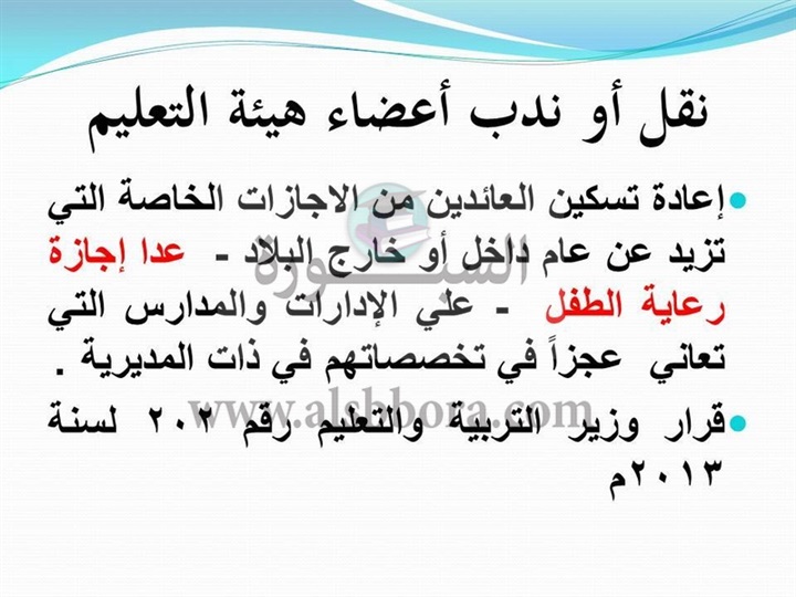 تنشر"السبورة" قرار وزير التربية والتعليم الخاص بضوابط إعادة توزيع المعلمين العائدين من اجازات خاصة.