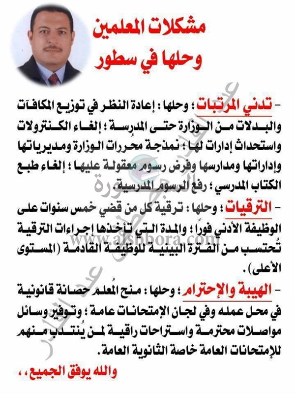 وشملت التدوينة عدد من المقترحات للحل تضمنت إعادة توزيع المكافآت والبدلات وترقية كل من قضي خمس سنوات ومنح المعلم حصانة قانونية.